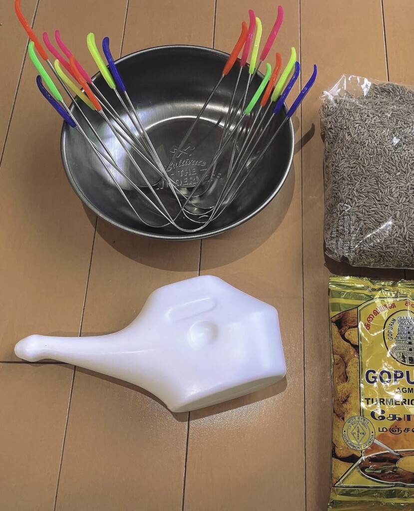 アーユルヴェーダの知恵を使い、花粉の季節を快適に過ごす。準備するもの・・・歯ブラシ、ネティポット、タンクリーナー