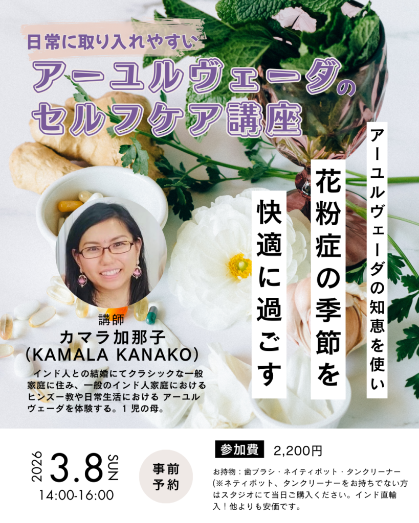 3/8㈰ 日常に取り入れやすいアーユルヴェーダのセルフケア講座1回目~花粉の季節を快適に~