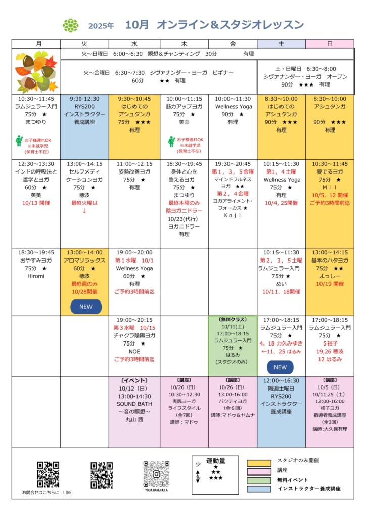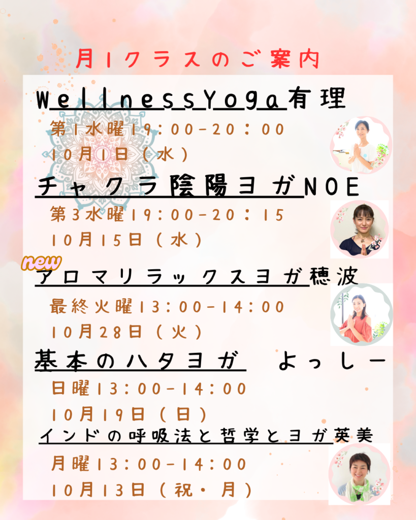 10/23(木)18:30-19:45 身体と心を整えるヨガ まつゆり →ヨガニドラー 有理